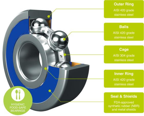 Equipped with FDA-approved NBR seals and metal shields for lubricant retention and corrosion prevention.